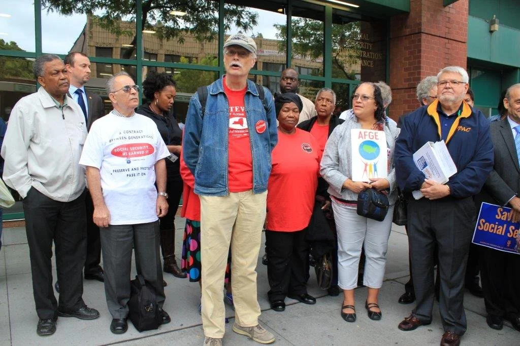 Dr. Sanjek in 2014 leading pro-Social Security increase rally at the Jamaica NY SSA administrative office