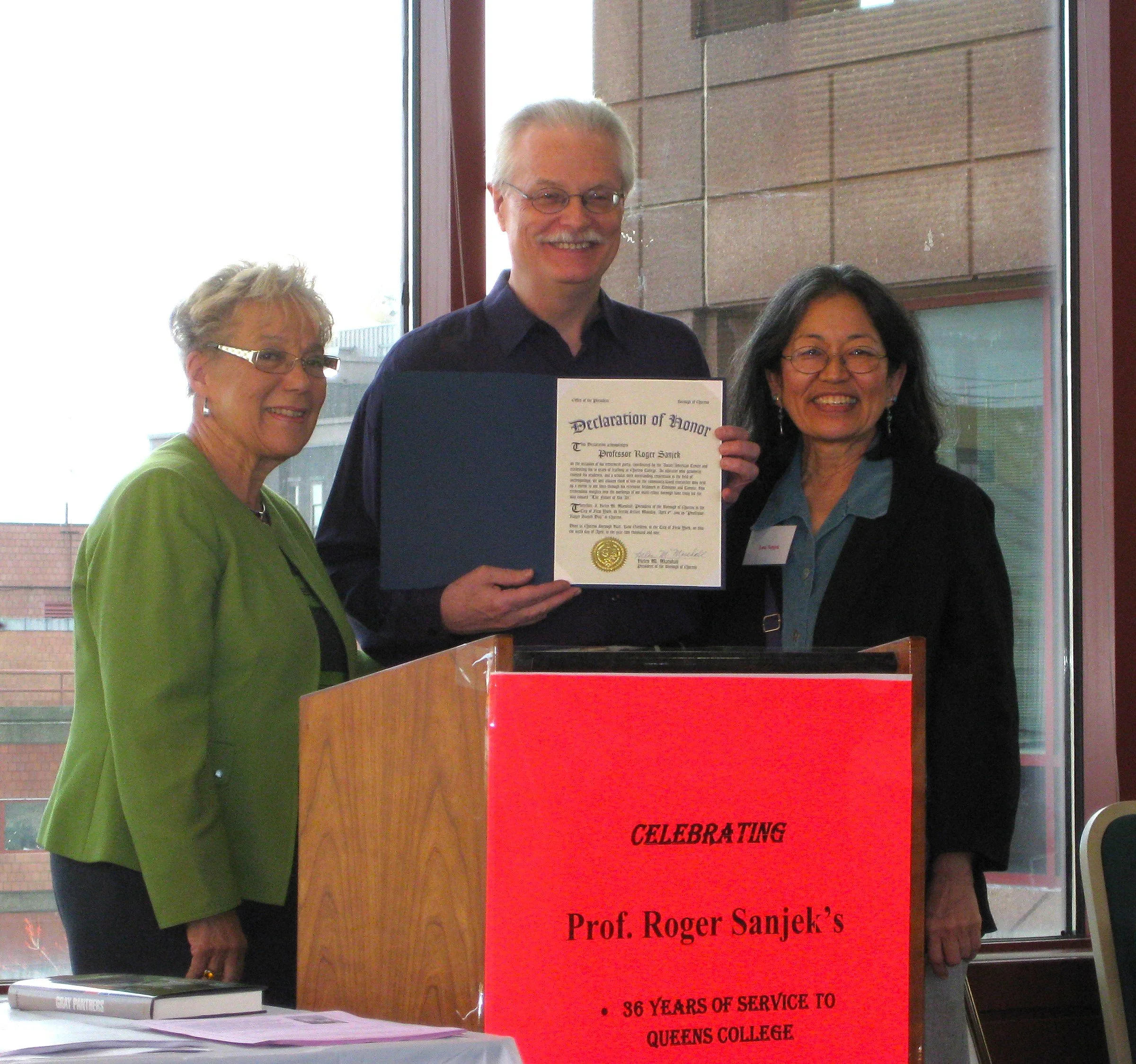 He retired from teaching at Queens College CUNY in 2008 after a 36-year tenure. The day of his official retirement in 2008 was declared “Roger Sanjek Day” in Queens in a proclamation presented by Queens Borough President Helen Marshall.