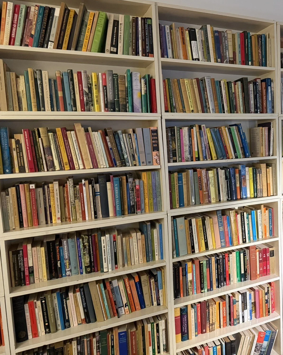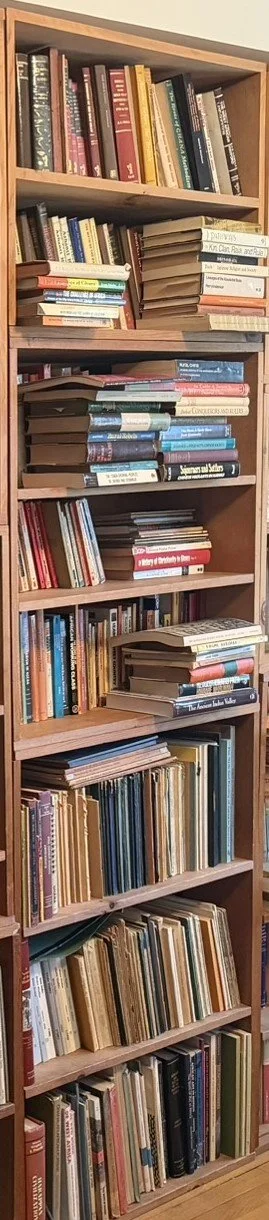 Each bookcase is pictured below with a list of the primary categories of the books shelved there. There is also a link to a list of all the books in each bookcase.